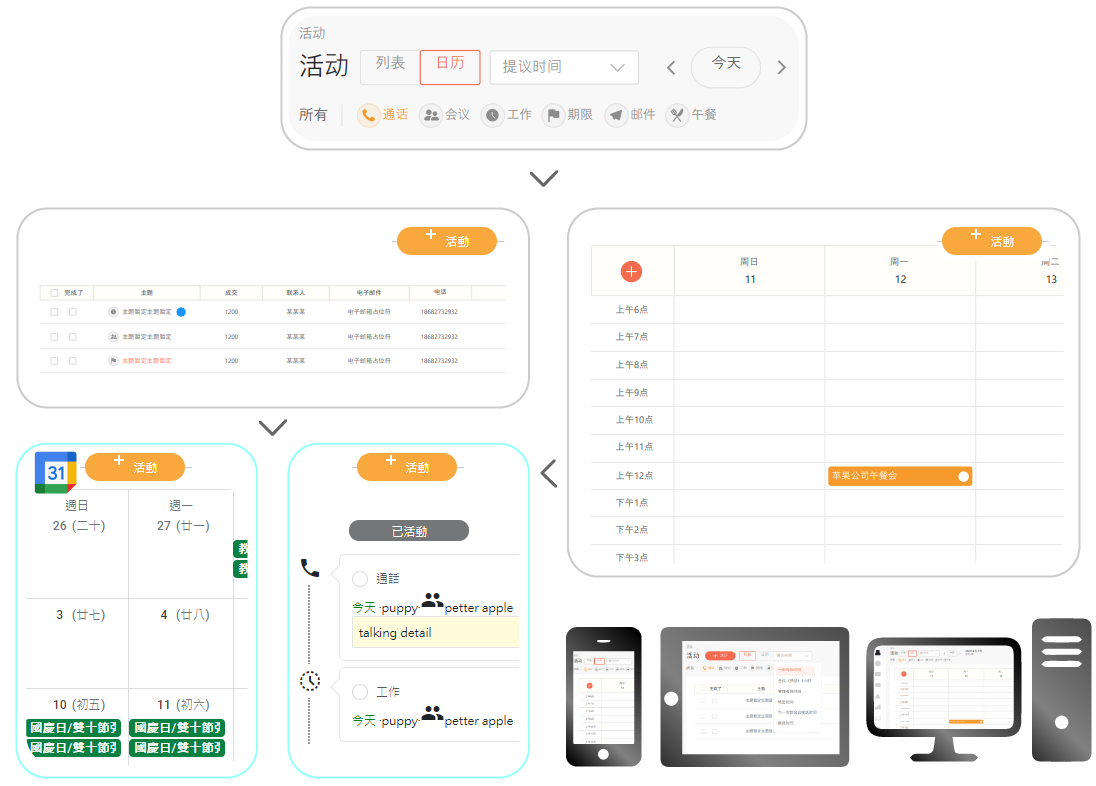 結合 Google 行事曆及我們CRM資料庫,在每一次的安排活動,同步更新多元裝置,讓您安排的活動不管在電腦、手機、平板...隨時都可翻閱。