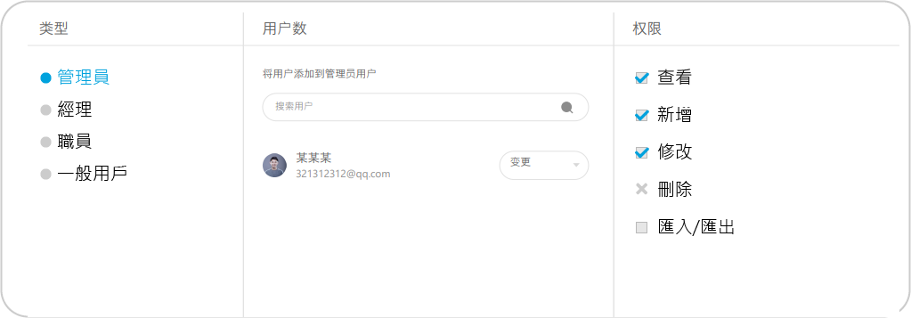 管理員可依企業需求設計多種權限,限定查看範圍,防止任意匯出或刪除資料,員工離職後也可快速凍結帳號。嚴密確保企業數據安全,維護企業權益。